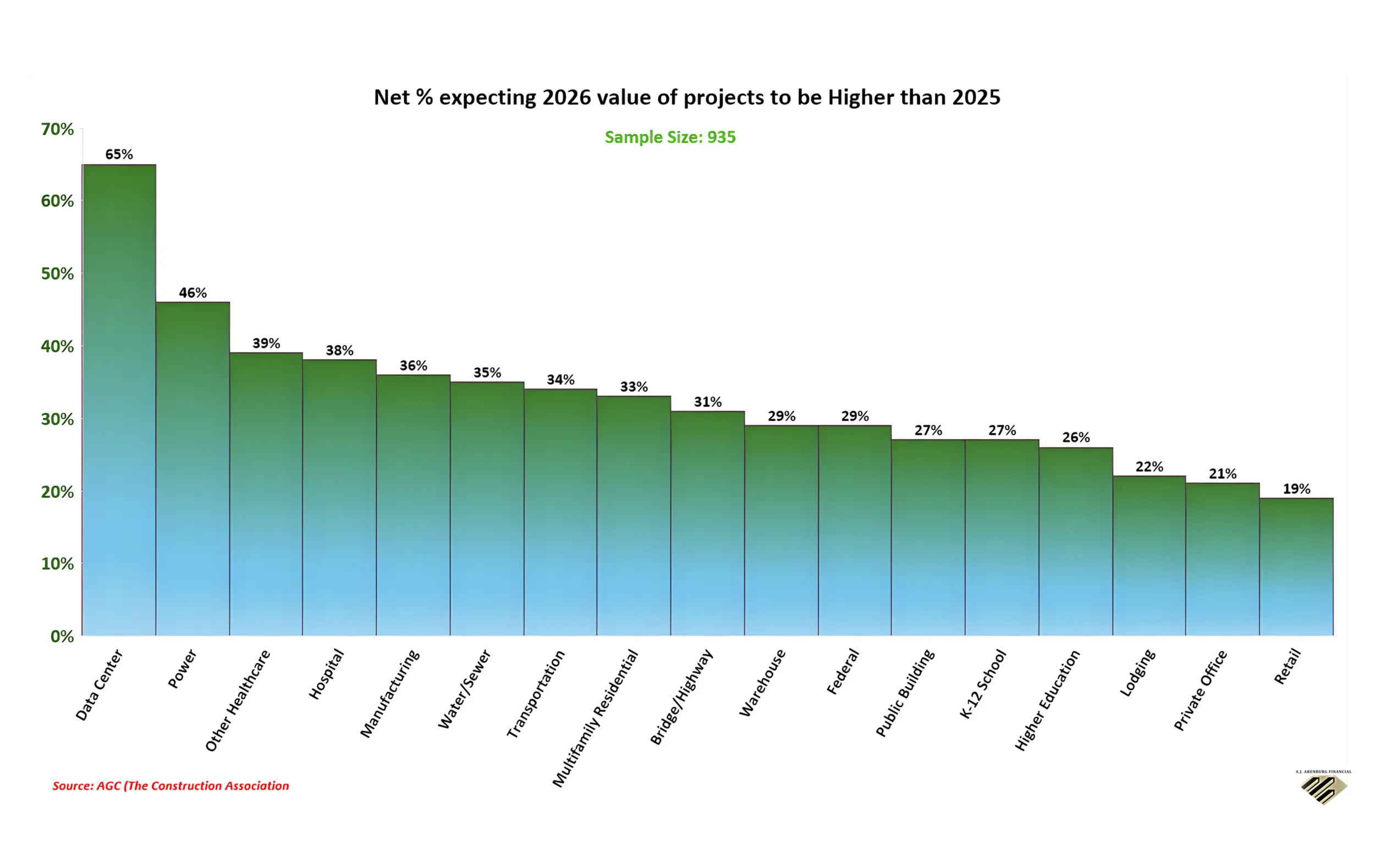 Data centers lead the market by a wide margin, followed by power, healthcare, and infrastructure-related segments. In contrast, sectors like office, retail, and lodging continue to struggle, with education and warehousing showing limited momentum. This divergence is clearly reflected in contractor expectations across the industry.
